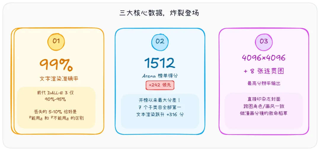 你没看错,是 99%。前代 DALL-E 3 大概在 90%-95% 之间,听起来也不差?但那丢失的 5-10 个百分点,恰好就是“能用”和“不能用”的区别——logo 字母写错、海报电话少一位、按钮文案多出空格,商业场景里都是灾难。GPT-Image-2 把这个坑基本填平了。