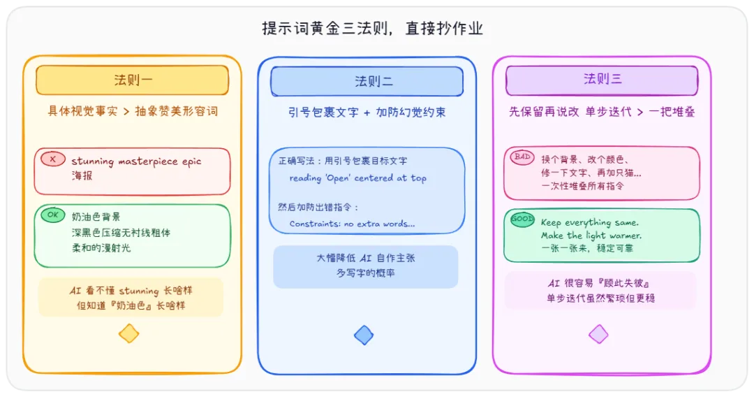 ❌ “一张 stunning 的 masterpiece 级 epic 海报” → ✅ “奶油色背景,深黑色压缩无衬线粗体,非对称版式块,柔和漫射光” AI 看不懂 “stunning” 长什么样,但它知道”奶油色背景”长什么样。描述越具体,画得越准。