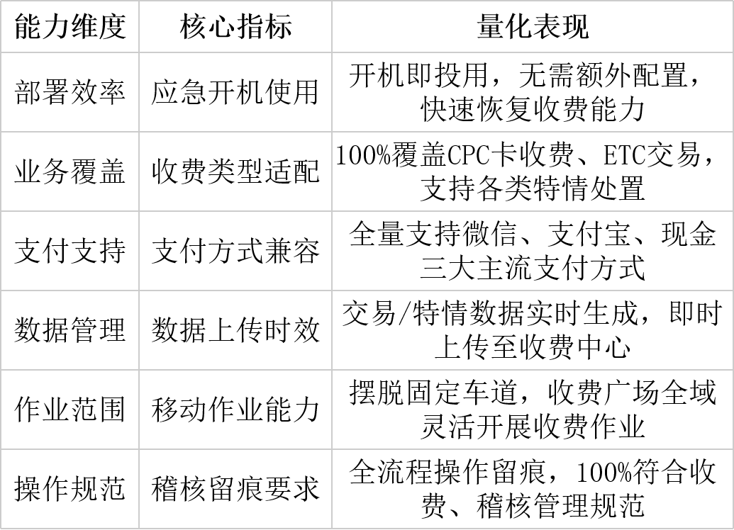 相比传统固定收费设备,这款应急收费终端产品以移动化、高效化、全面化、规范化为核心,成为高速公路收费站应急保障的不二之选: