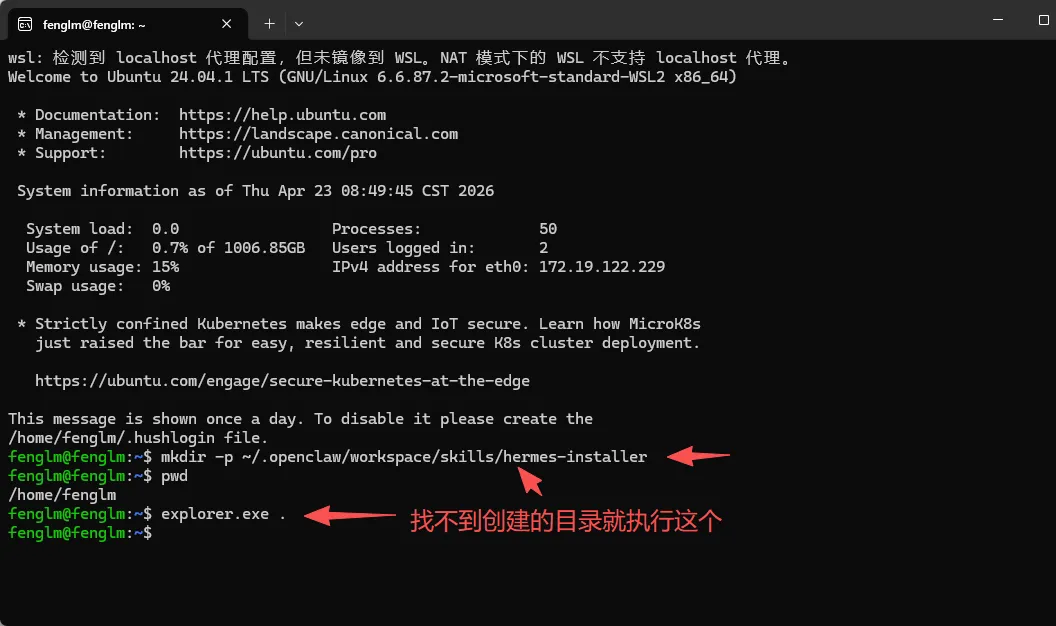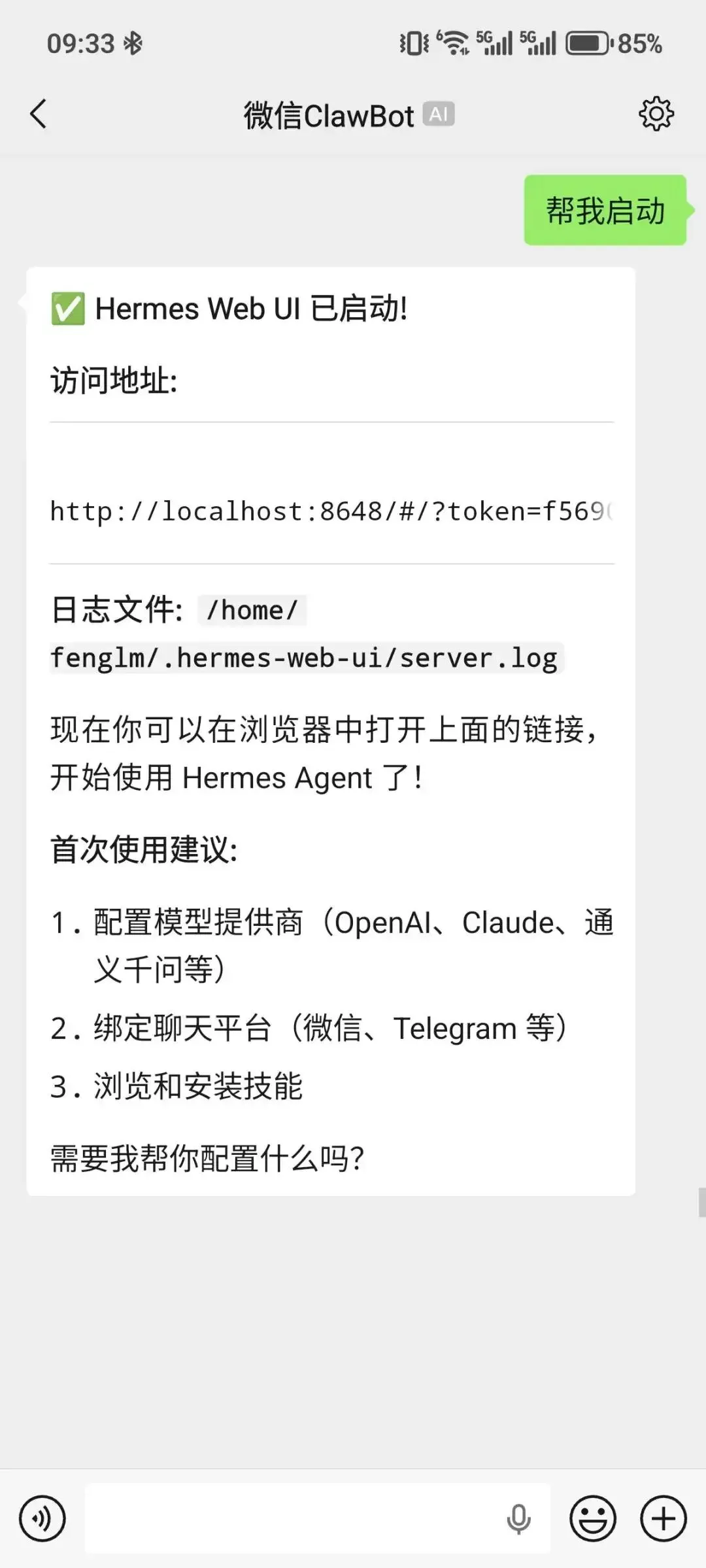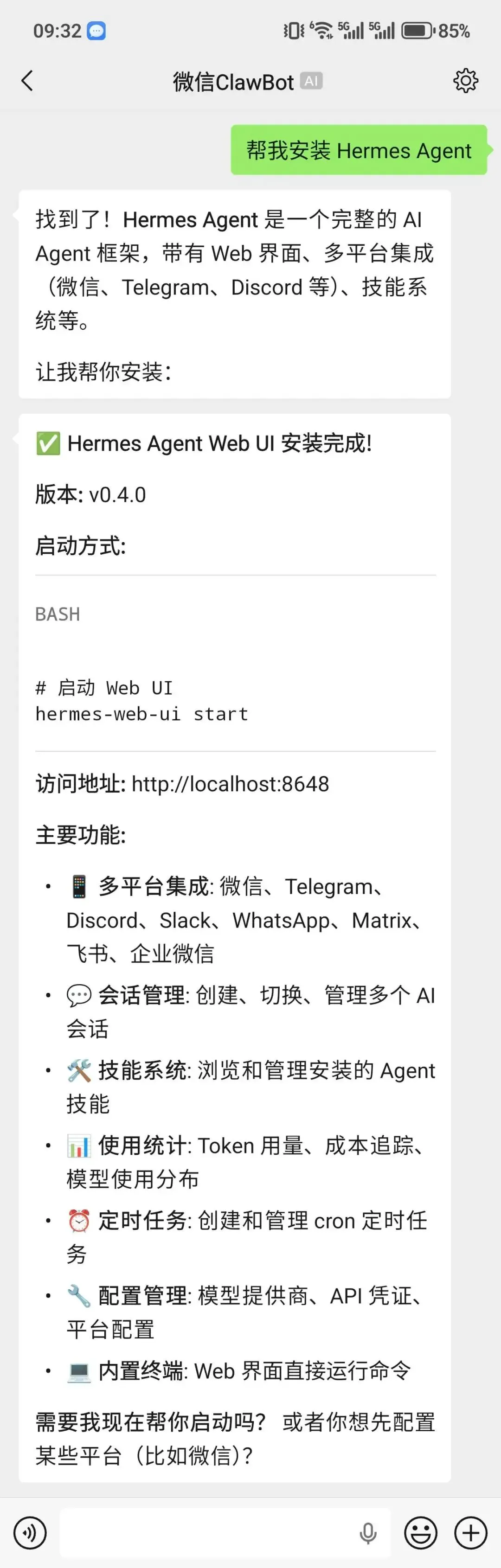 OpenClaw会自动认出这个Skill,当你在微信发「帮我安装Hermes Agent」时,它就知道该干嘛了