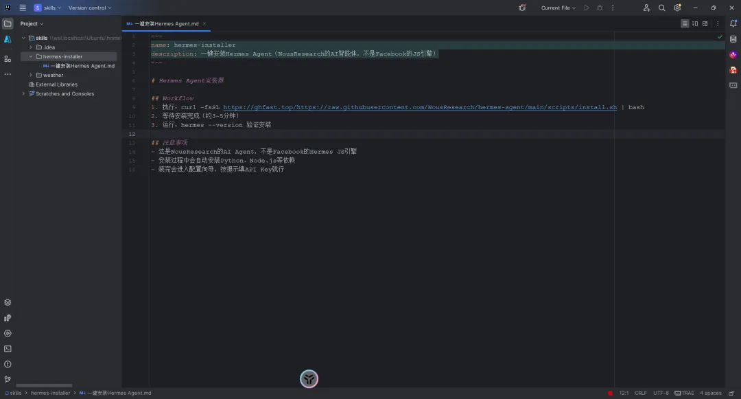 ---name: hermes-installerdescription: 一键安装Hermes Agent(NousResearch的AI智能体,不是Facebook的JS引擎)---# Hermes Agent安装器## Workflow1. 执行:curl -fsSL https://ghfast.top/https://raw.githubusercontent.com/NousResearch/hermes-agent/main/scripts/install.sh | bash2. 等待安装完成(约3-5分钟)3. 运行:hermes --version 验证安装## 注意事项- 这是NousResearch的AI Agent,不是Facebook的Hermes JS引擎- 安装过程中会自动安装Python、Node.js等依赖- 装完会进入配置向导,按提示填API Key就行