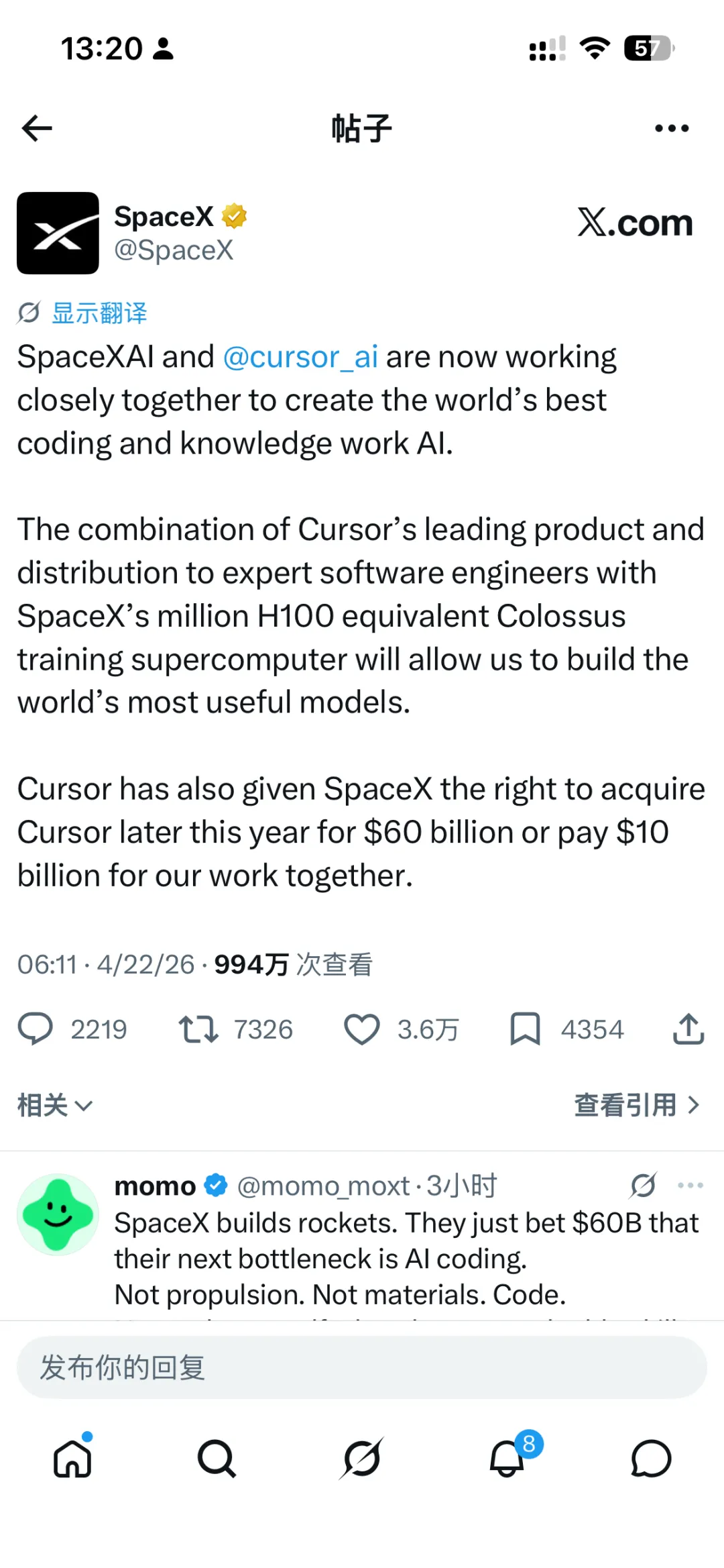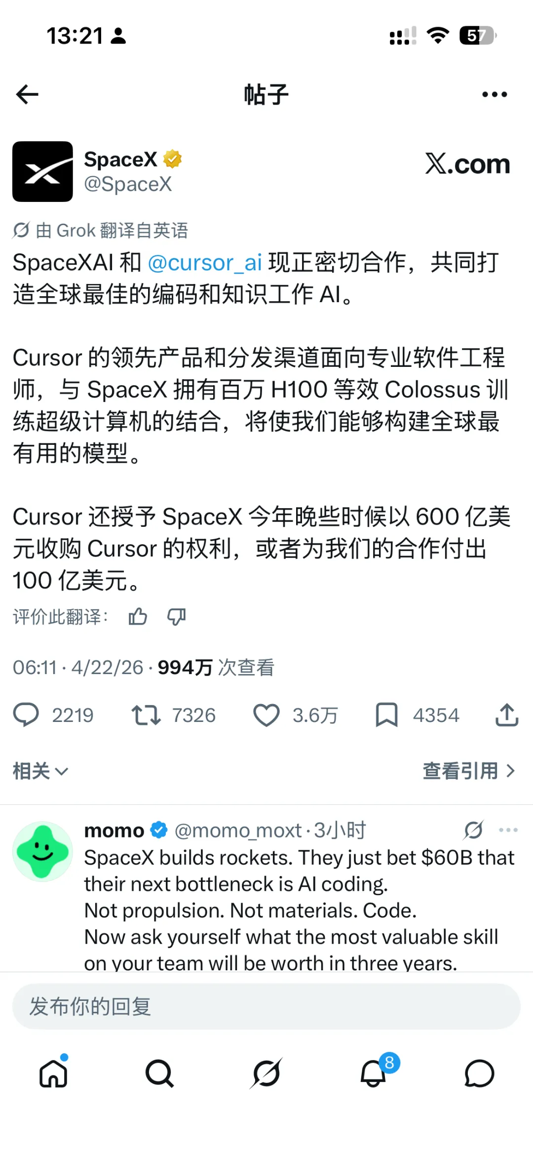 4月21号,SpaceX发了一条声明,说他们拿到了收购Cursor的权利,估值最高600亿美元。如果不收购,也可以选择付100亿继续合作。