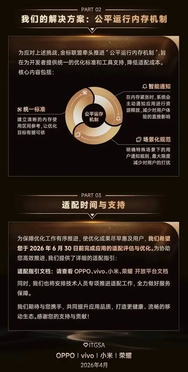 2021年9月,金标联盟(ITGSA)正式成立。百度、OPPO、腾讯、vivo、小米——这些名字排在一起,像极了一场行业自救的宣誓 。四年后的2026年4月,他们终于发布了一份关于”公平运行内存机制”的通知,要求开发者在6月30日前完成适配 。