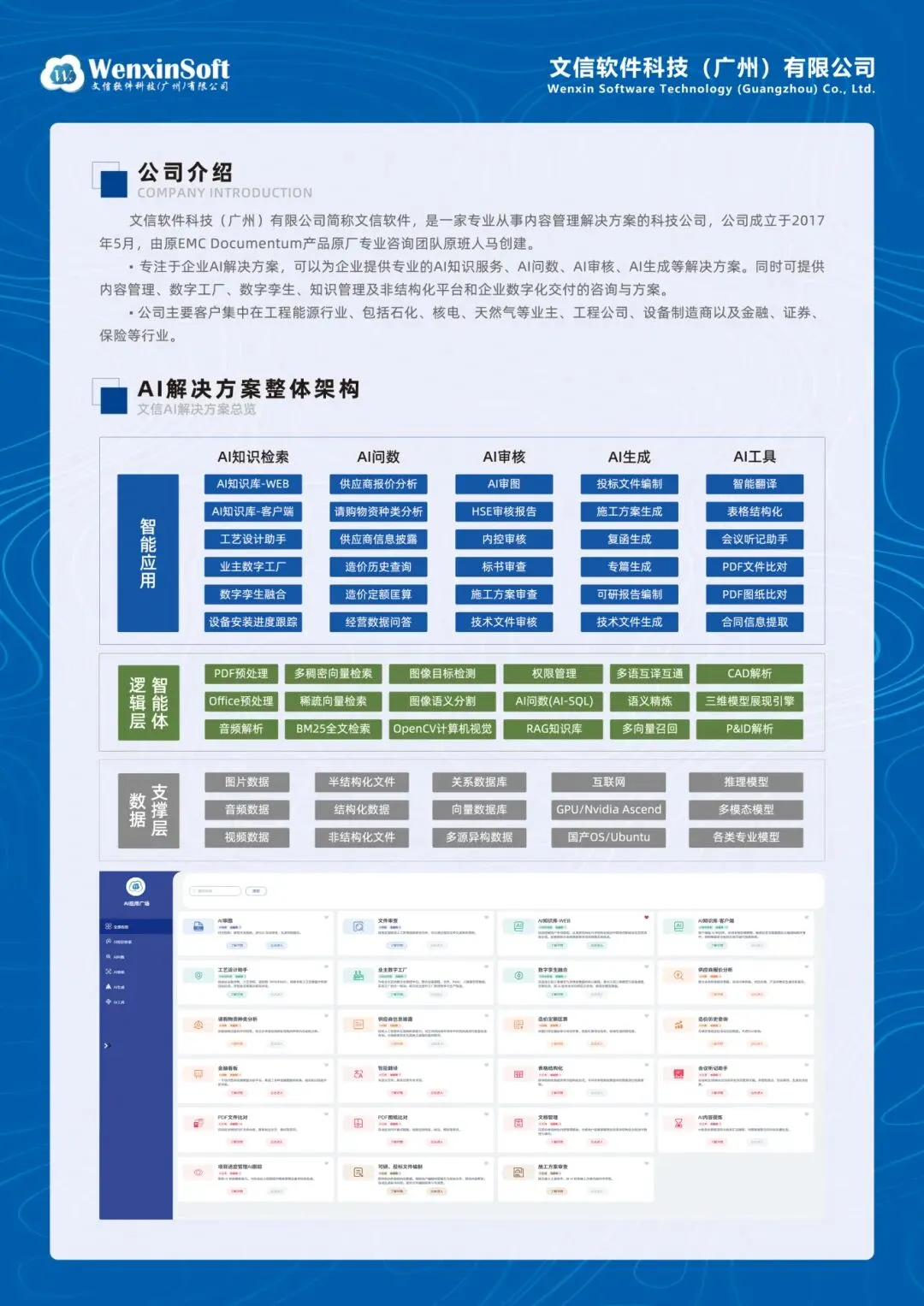 文信软件科技(广州)有限公司,核心团队源自全球领先的企业内容管理平台原厂,自成立以来始终专注于工程能源等复杂行业的数字化解决方案。凭借对行业非结构化数据管理的深刻理解,公司自AI浪潮兴起之初便深耕技术与业务的结合,已成功服务中石化、中海油、国家电投等众多头部客户,并积累了多项相关专利与软著。