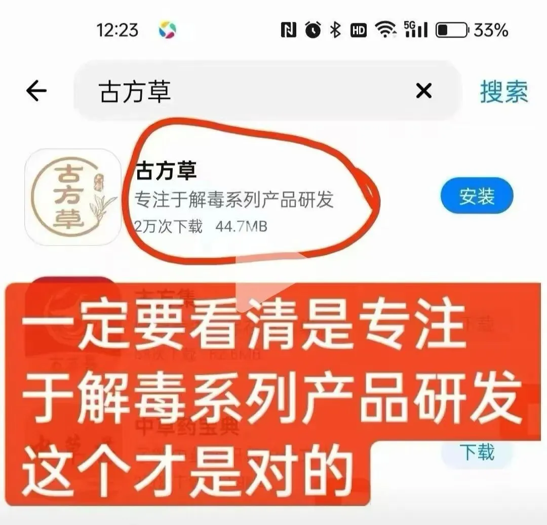 古方草出圈了,火爆到各种假冒,连app也有蹭流量的,大家下载古方草软件的时候认准带“专注于解毒系列产品研发”字样的图标,