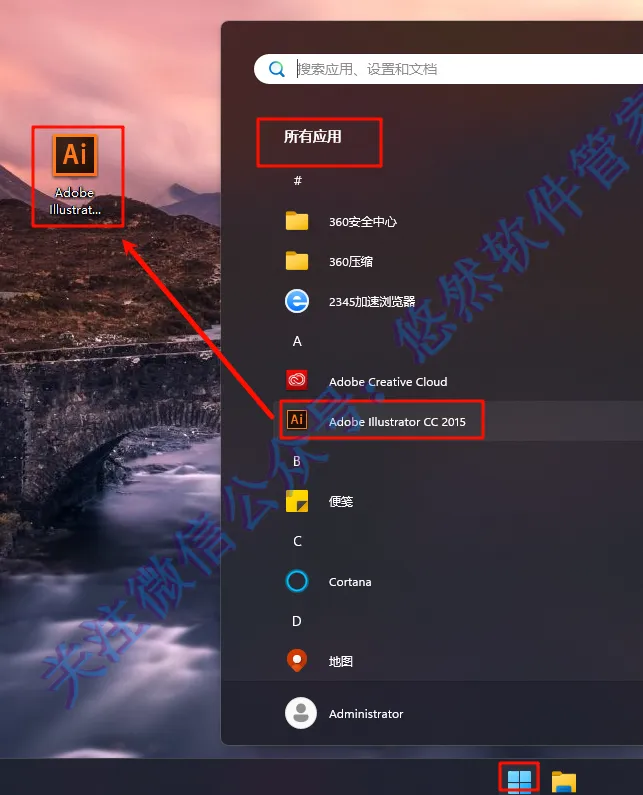 12.点击【开始】菜单,点击【所有应用】在里面找到【Adobe Illustrator CC 2015】图标,将图标拖移至桌面