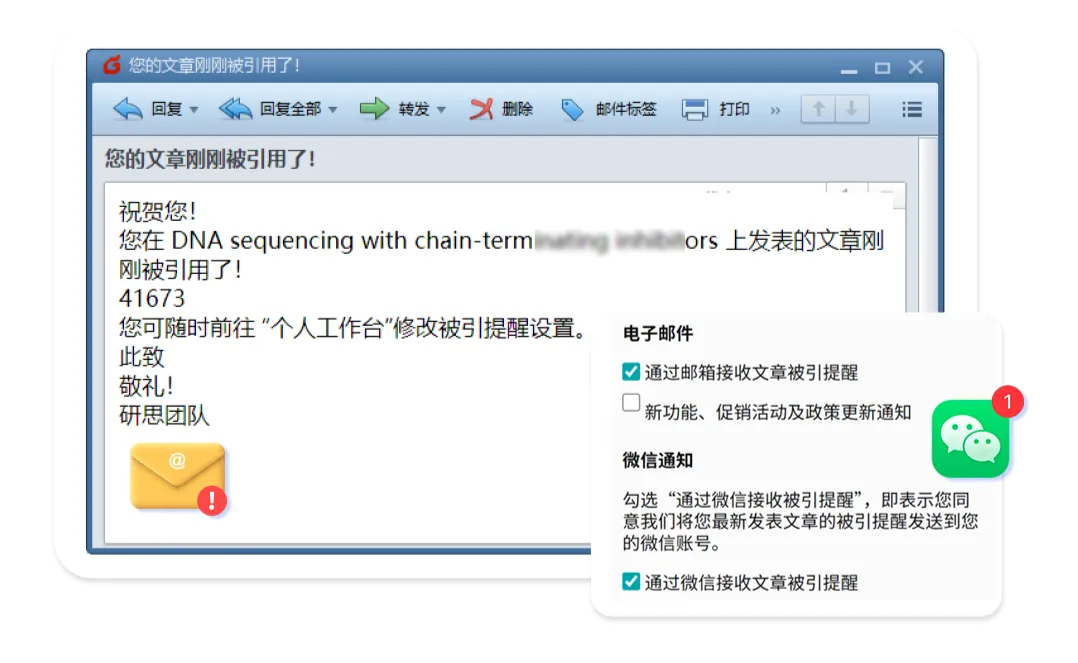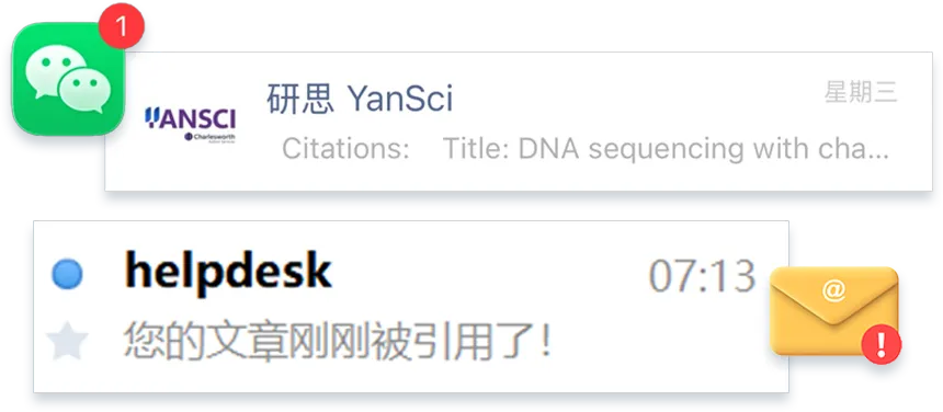 以往,研究者若想追踪论文的引用情况,往往需要依赖数据库手动检索或等待年度更新。YanSci彻底革新了这一流程——支持微信与邮箱双通道即时提醒,当你的论文被引用时,你将第一时间收到通知,实时掌握学术动态。