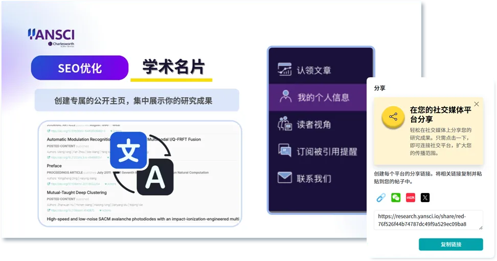 在YanSci平台上,每位科研人员都可以创建个人专属主页,一站式展示你的学术成果、引用趋势、传播热度等关键信息。主页内置SEO优化与社交分享功能,有效提升在微信、搜索引擎及主流学术数据库中的曝光度。