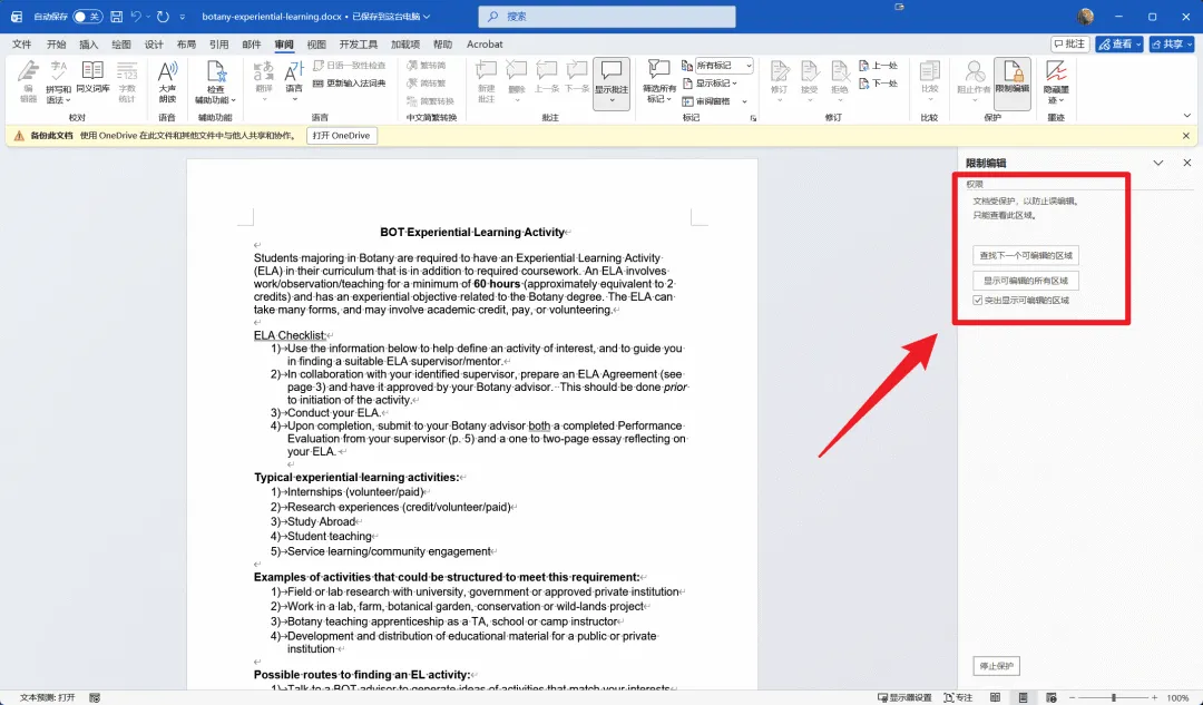 从截图可以看到,文档设置完成后,在 Word 的“审阅”区域会出现限制编辑面板,右侧显示“文档受保护,以防止误编辑,只能查看此区域”等提示。这说明文件已经进入受保护状态,用户不能像普通文档那样随意修改正文内容。
