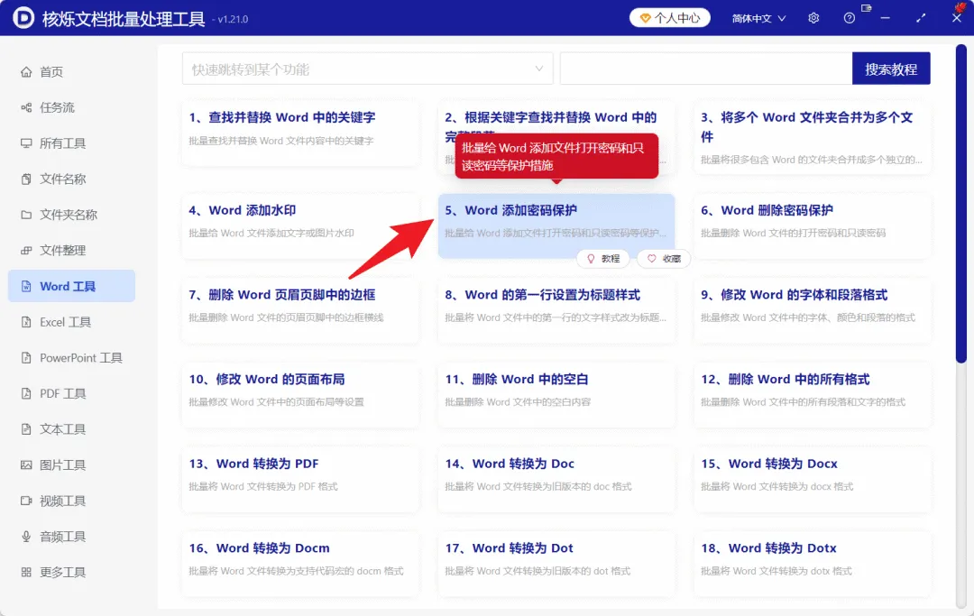 打开核烁文档批量处理工具后,在左侧选择Word 工具。在功能列表中找到并点击“Word 添加密码保护”。