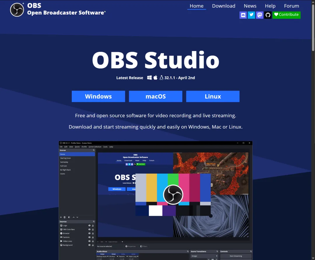 OBS Studio 是一个强大的录屏和直播推流软件首先它支持高清录制和高清音频规格,还支持高码率推流还可以设置多个屏幕,录制软件窗口,也支持相机外置设备它还有多重混音支持Windows,Linux 和Mac