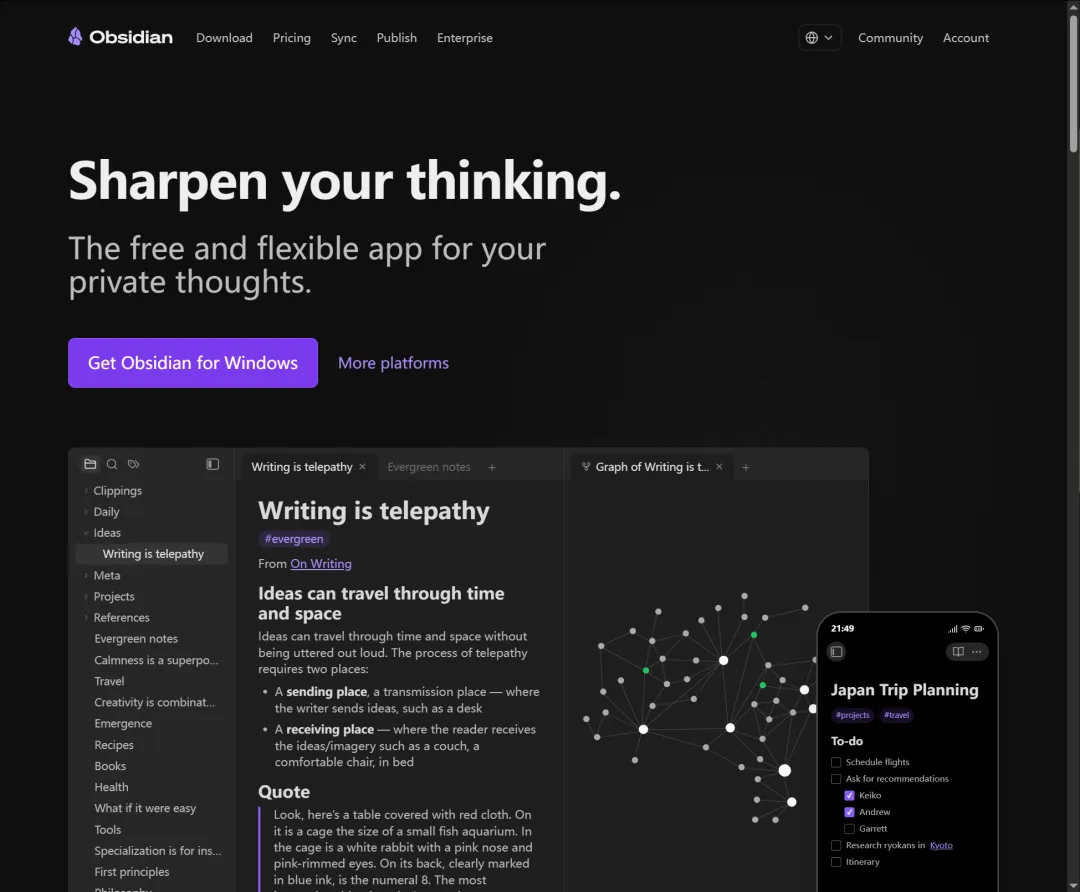 Obsidian 是一个特别强大的文笔记软件首先它内置了链接,可以将不同内容跳转连接起来,比如说对应的文件、网页等等内容它的 CANVAS 画布功能也特别强大可以比如说可以放置不同不同类型的模板,添加不同的组件等等它还内置了很多插件,有1000 多种,比如自定义云同步、各种编辑器等等内容,大家可以搜索使用它还有网页采集工具,可以一键将内容采集到里面,而且还可以离线阅读Obsidian 全平台支持,它的同步功能每月5 更新,发布功能每月10 更新