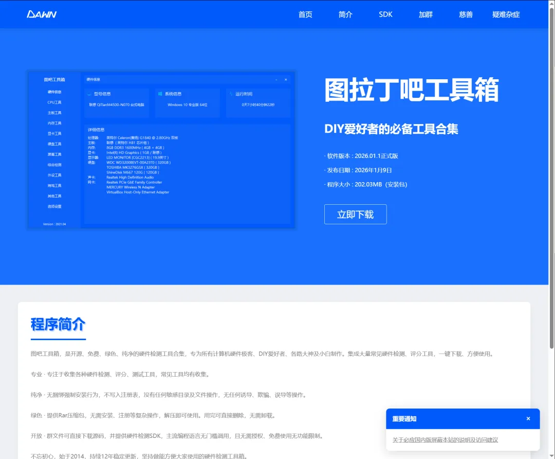 图吧工具箱是一款特别强大的工具箱软件首先可以检测电脑的硬件信息,CPU 系主板显卡等等,还可以当做烤机工具我们使用它一般就是刚买的电脑,使用U盘启动,跳过Win 激活,然后检测电脑是不是翻新的它可以替代X大师,只需要一个工具就可以替代好多工具关键它绿色免费,而且还开源,可以说是最清爽的硬件检测工具了只有 Windows 版本