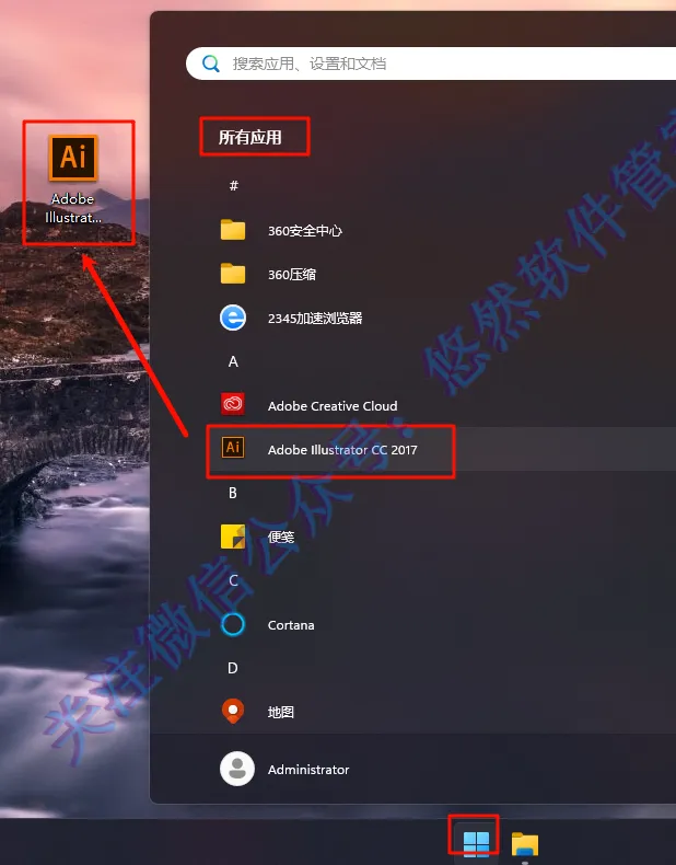 8.点击【开始】菜单,点击【所有应用】在里面找到【Adobe Illustrator CC 2017】图标,将图标拖移至桌面