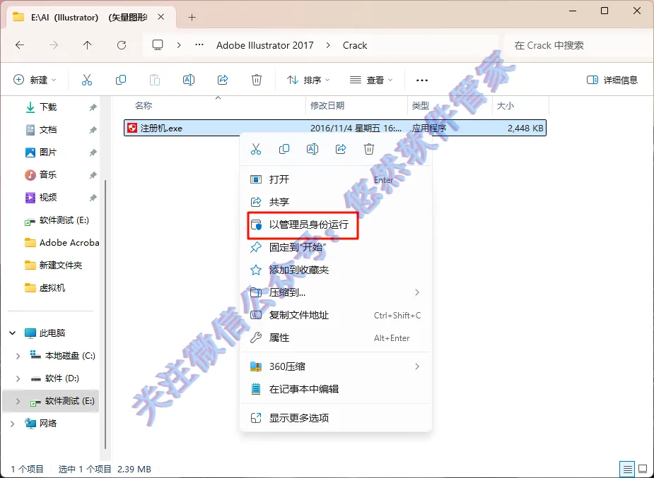 10.选中【注册机】应用程序,右键点击选择【以管理员身份运行】