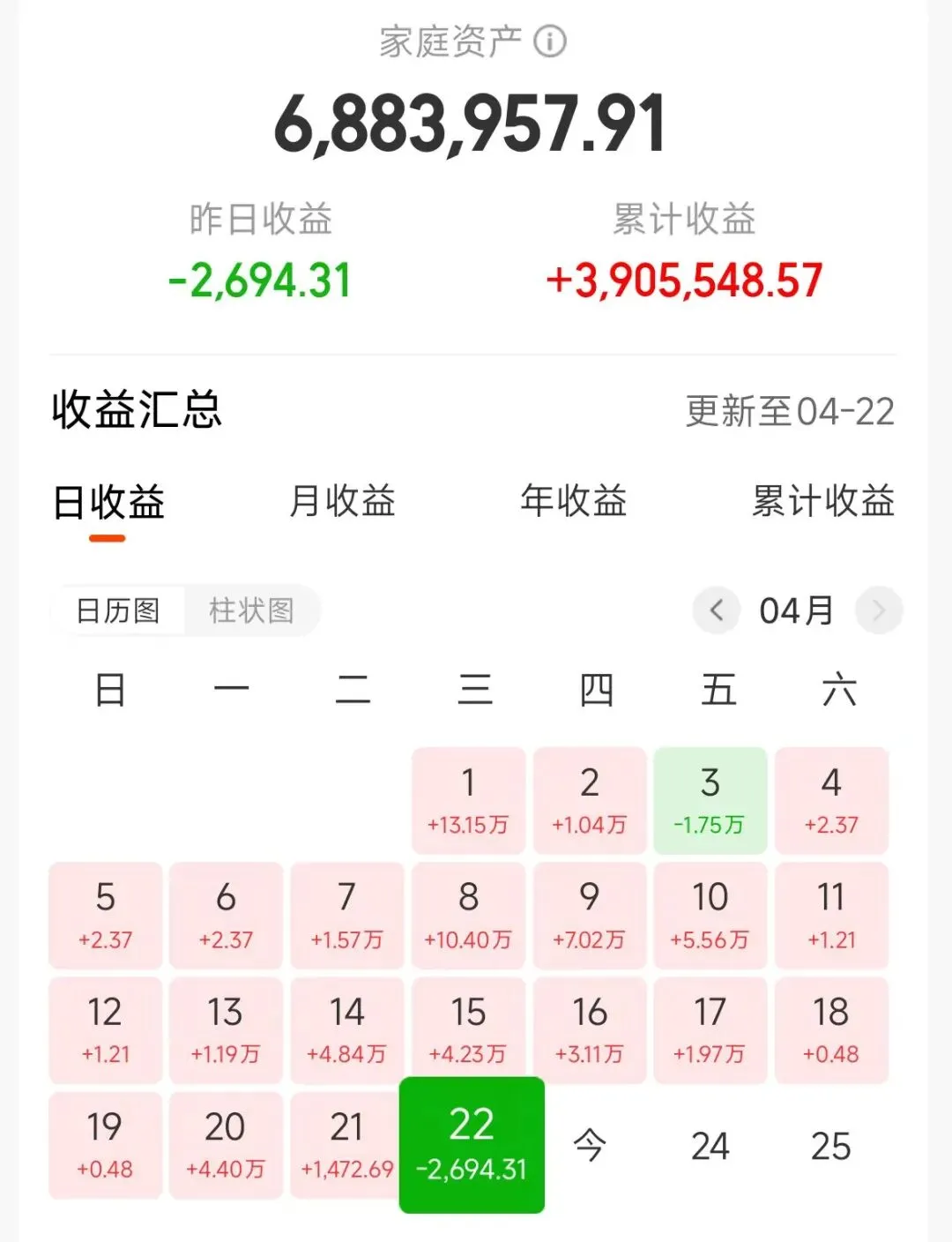 十拳剑灵觉得,投资不是赌博,不能只看着眼前涨得欢。再平衡的效果,从账户上能看出来。目前十拳剑灵总资产688万左右,累计收益390多万。即使在4月22号市场调整、单日只亏了两千多块的时候,整个组合也稳稳的。4月初单日大赚13万固然爽,但通过再平衡,让组合在波动中少回撤、更稳当,才是十拳剑灵追求的。