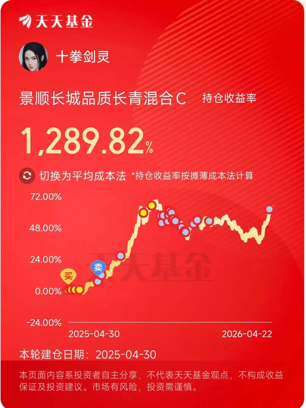 像景顺长城品质长青混合C,持仓收益率到了1289.82%!