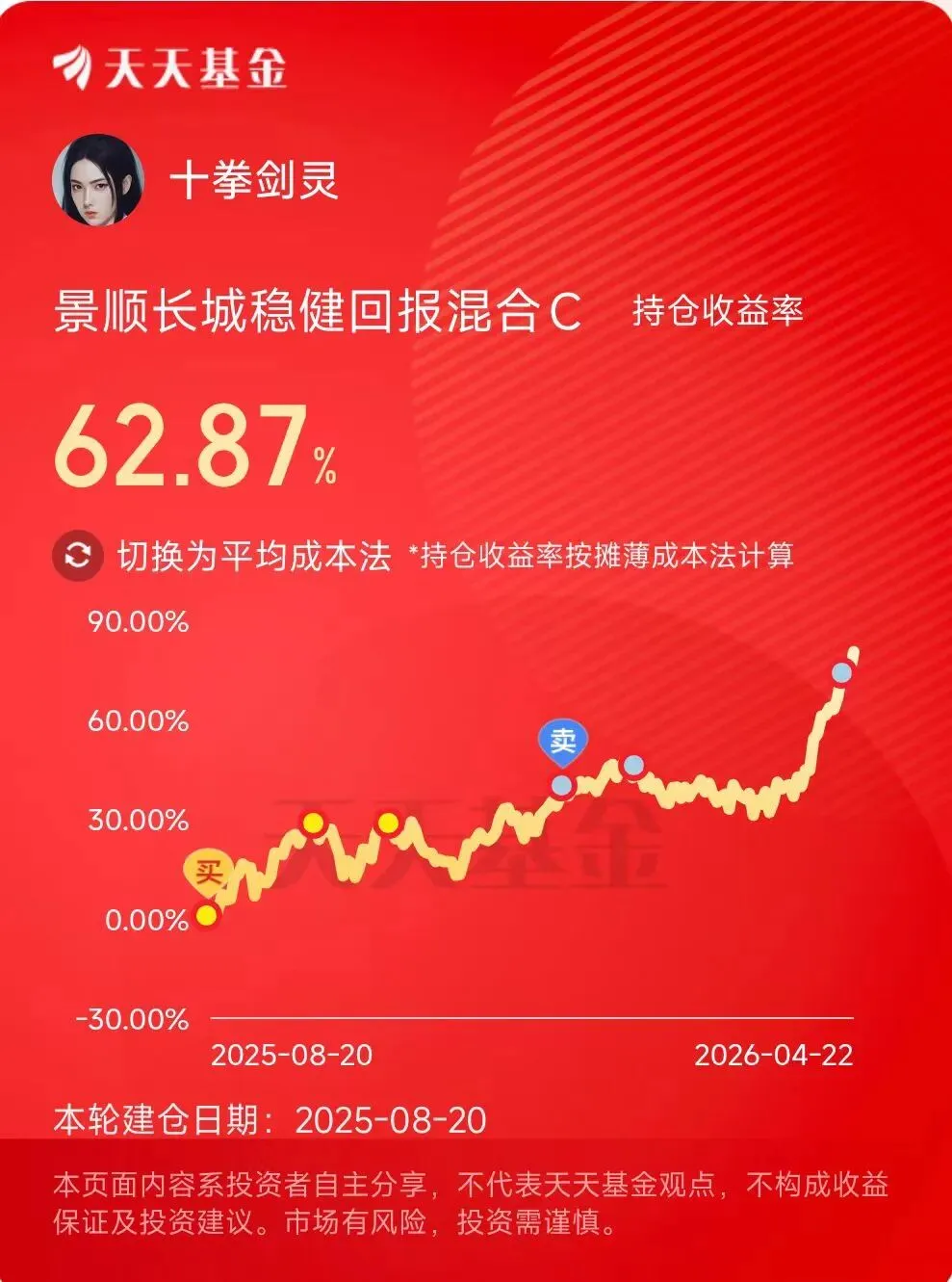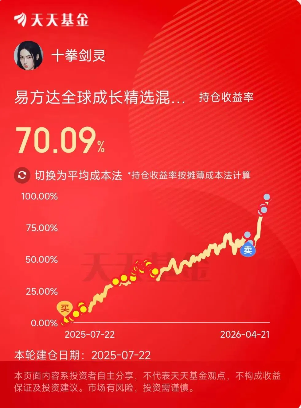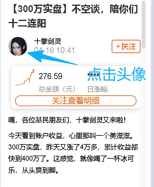 点击天天基金平台上的十拳剑灵的头像链接,进入主页就能看到十拳剑灵的公开实盘持仓。