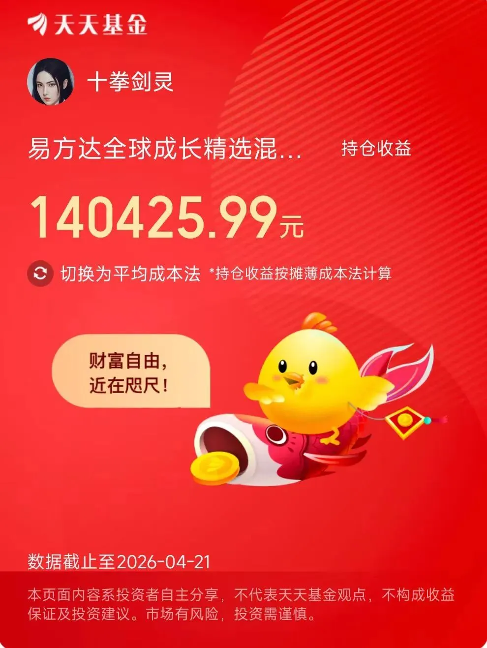 还有易方达全球成长精选混合,收益率70.09%,单只赚了14万多。