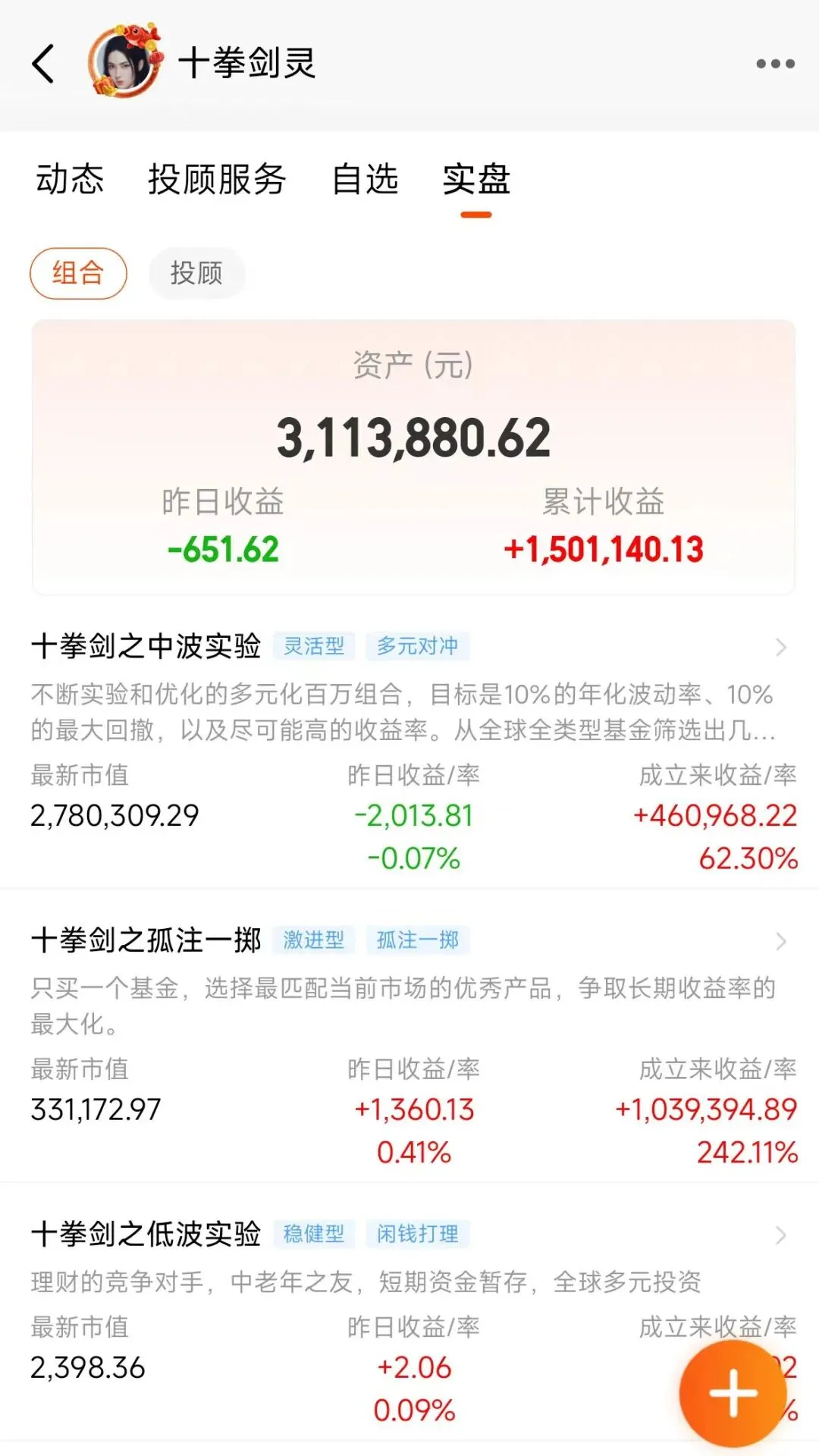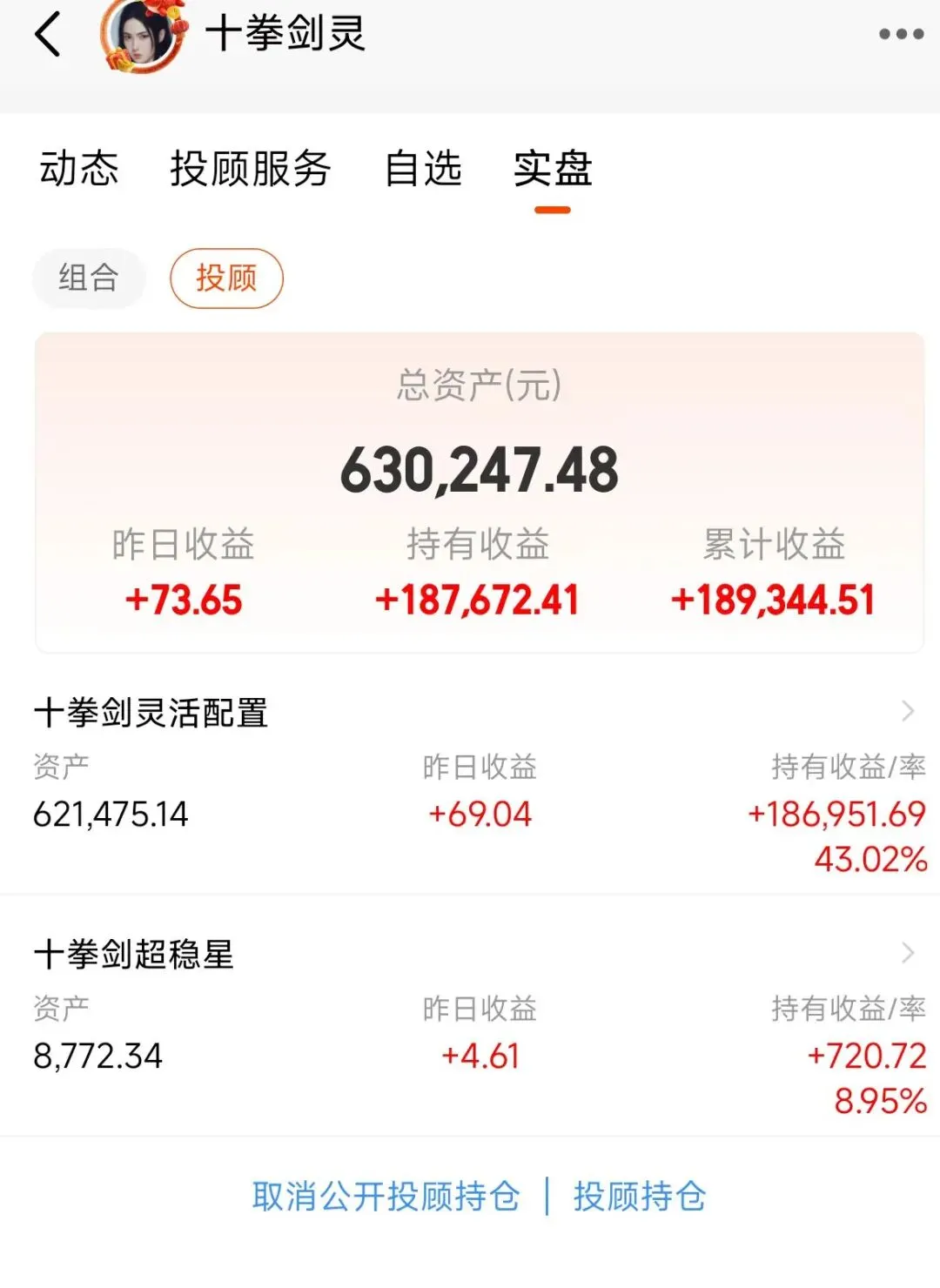 在个人主页的“实盘”菜单中,同时公开了“组合”与“投顾”。组合是个人基金组合,与投顾配置基本一样。投顾是我持有的投顾产品。