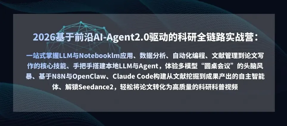 🌟 课程一:2026最新AI驱动科研全链路实战营:一站式掌握LLM与Notebooklm应用、数据分析、自动化编程、文献管理到论文写作的核心技能、手把手搭建本地LLM与Agent,体验多模型“圆桌会议”的头脑风暴、利用N8N与OpenClaw打造你的“个人AI助手”,实现科研流程自动化、解锁Seedance2,轻松将论文转化为高质量的科研科普视频