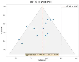 4.代码经双轮审阅:所有脚本经两轮代码审阅(Codex Review),Egger检验修正为加权回归(WLS)、SMD方差统一为含J²的Hedges标准公式、PRISMA计数改为动态计算,统计公式逐项验证。