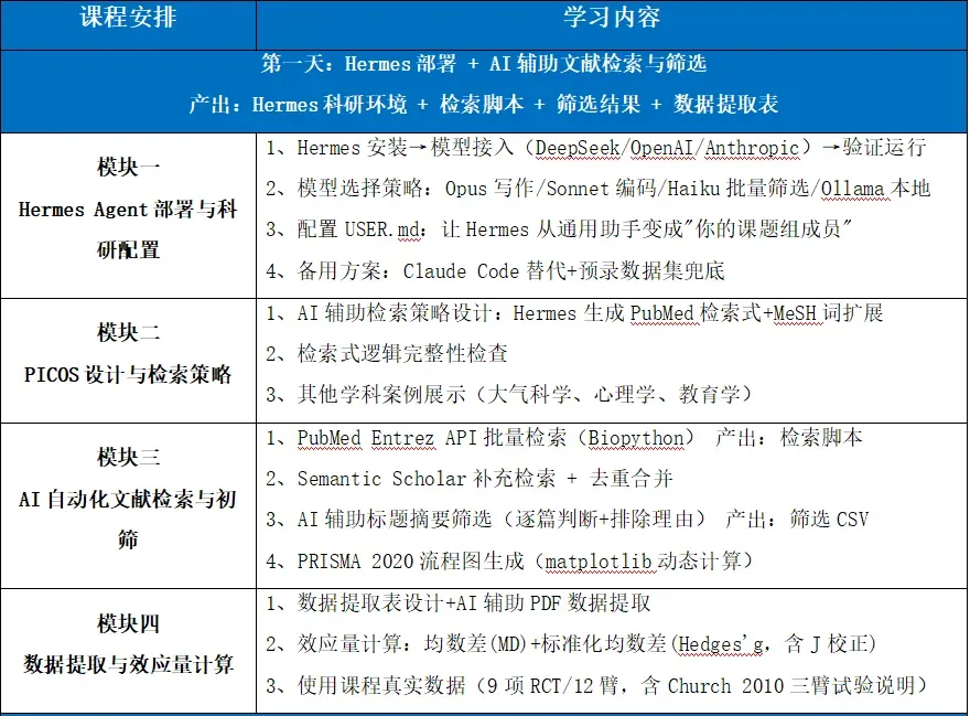 3.AI深度提效:用Hermes Agent自动生成检索式、批量筛选文献、运行统计脚本、生成投稿级图表、撰写Results段落——亲眼见证AI把传统2周的工作压缩到2小时。