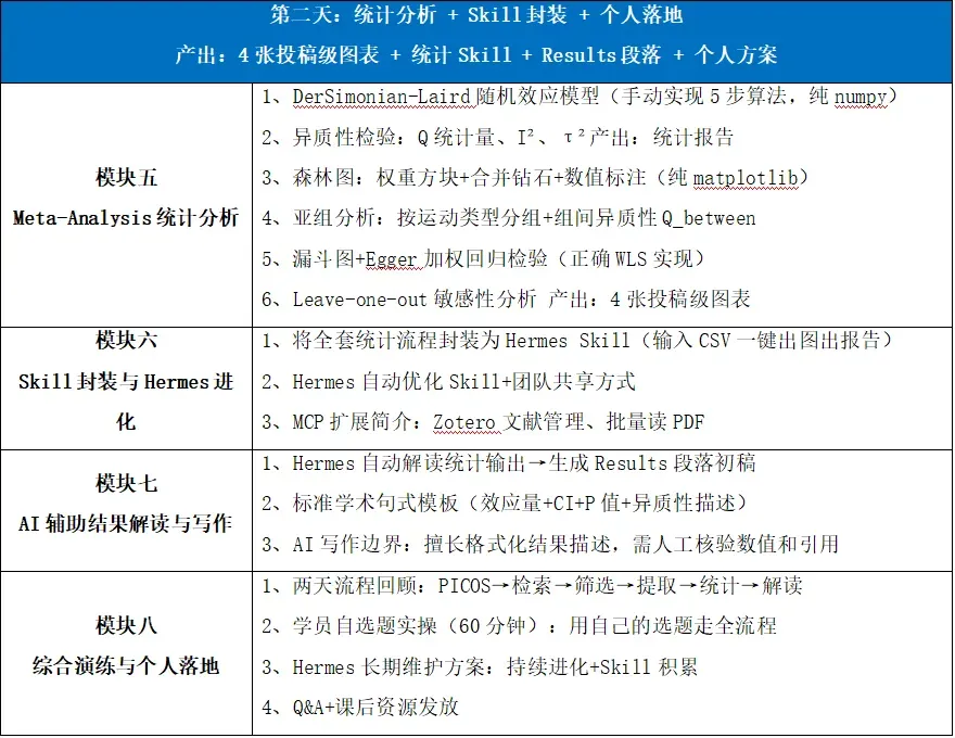 5.带走你的专属科研智能体:你将带走一个配置好的Hermes Agent和Meta-Analysis统计Skill,利用其自进化能力,未来可一键复用到你的任何课题中。