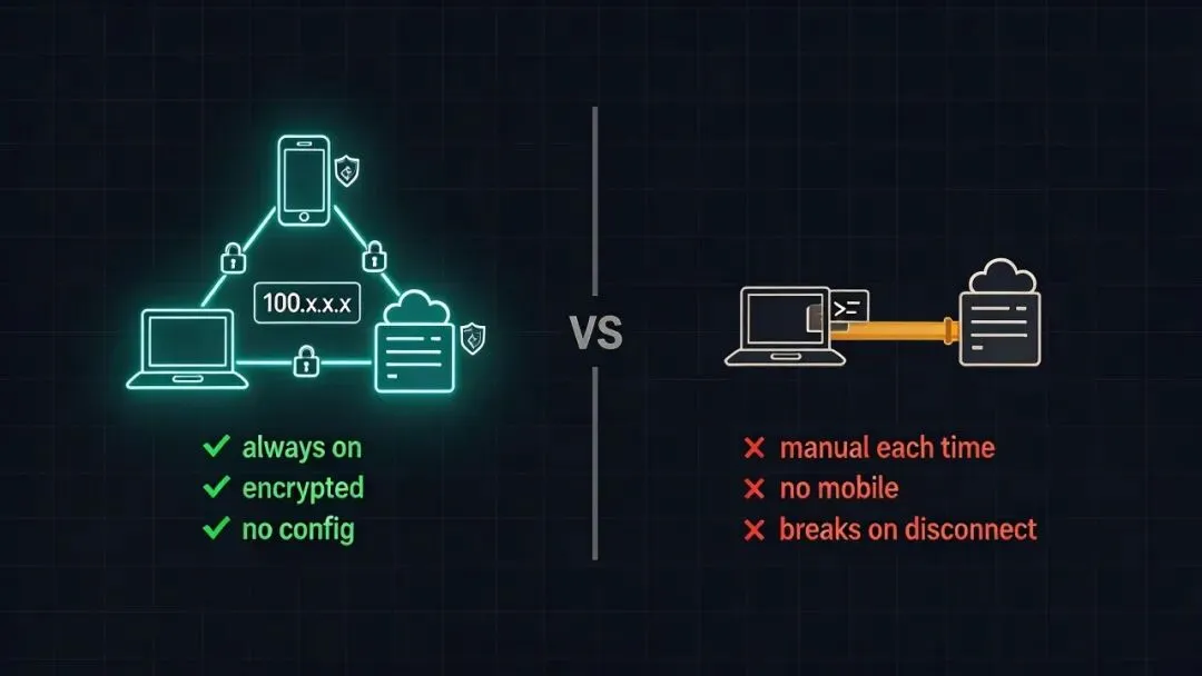 缺点:每次都要手动建隧道,手机上不好操作,断网就断了。Tailscale 能 set-and-forget,SSH 隧道做不到。