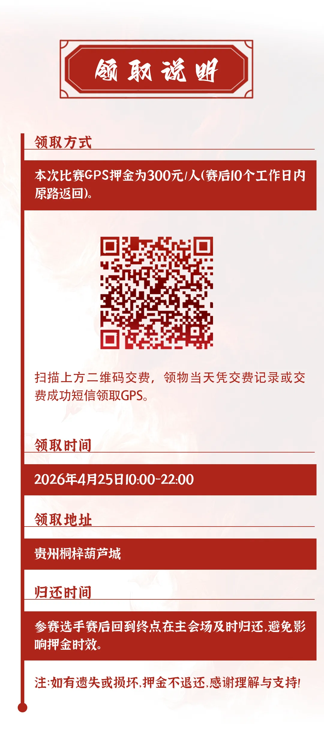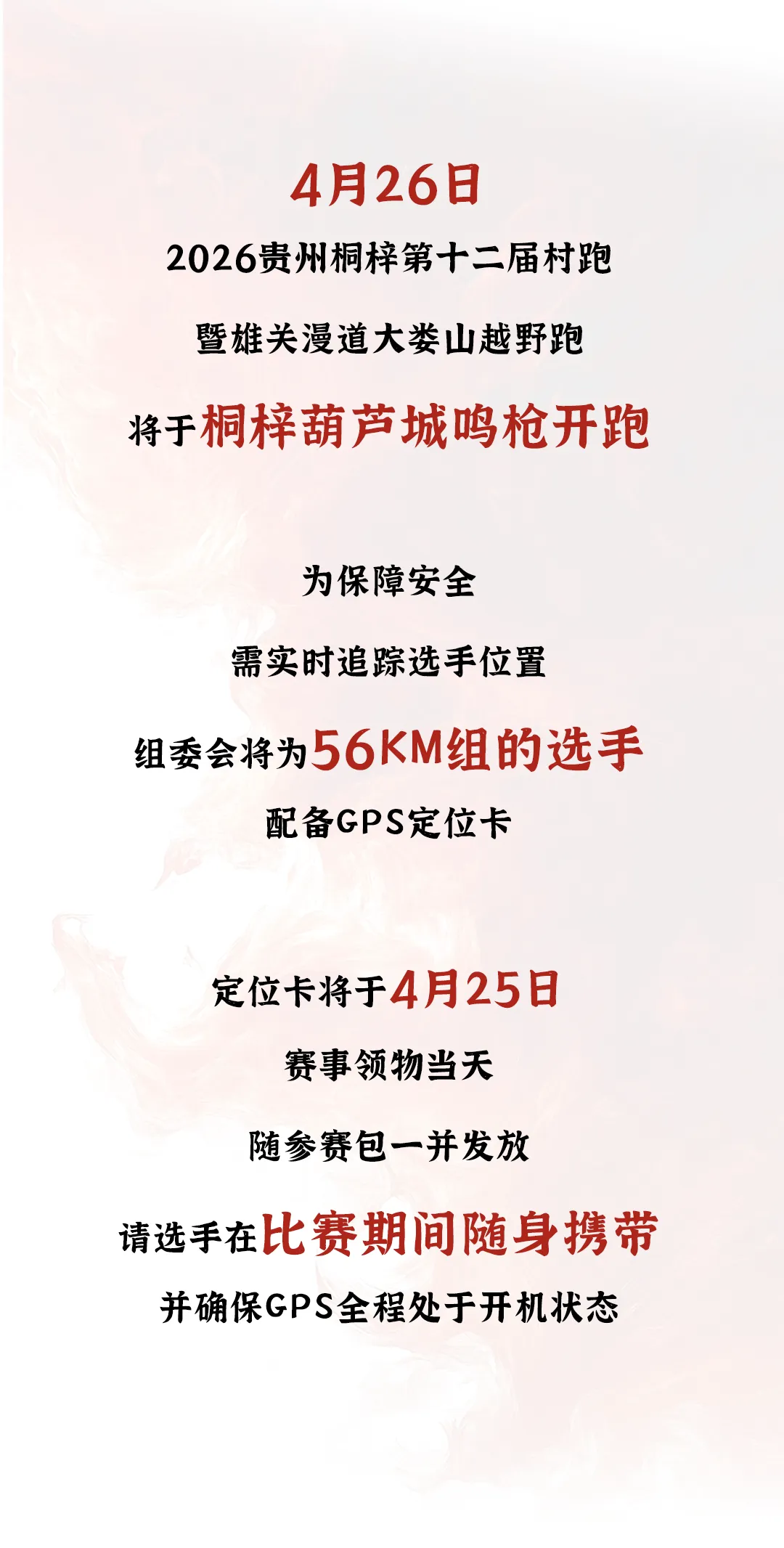 GPS押金缴纳及使用说明 || 2026贵州桐梓第十二届村跑暨雄关漫道大娄山越野跑 · 往期推荐 参赛号查询 || 2026桐梓村跑暨大娄山越野跑 参赛包邮寄通知 || 2026桐梓村跑暨大娄山越野跑 赛道装备 || 2026桐梓村跑暨大娄山越野赛 娄山组56KM赛道解析、轨迹下载 花海组33KM赛道解析、轨迹下载 青山组18KM赛道解析、轨迹下载 急救跑者 || 2026桐梓村跑暨大娄山越野跑 警察护跑 || 2026桐梓村跑暨大娄山越野跑 精英选手 || 2026桐梓村跑暨大娄山越野跑 赛事问答 || 2026桐梓村跑暨大娄山越野赛 交通出行 || 2026桐梓村跑暨大娄山越野赛