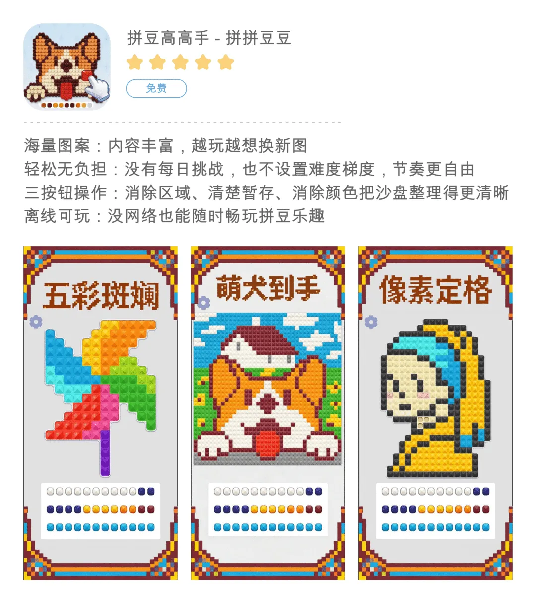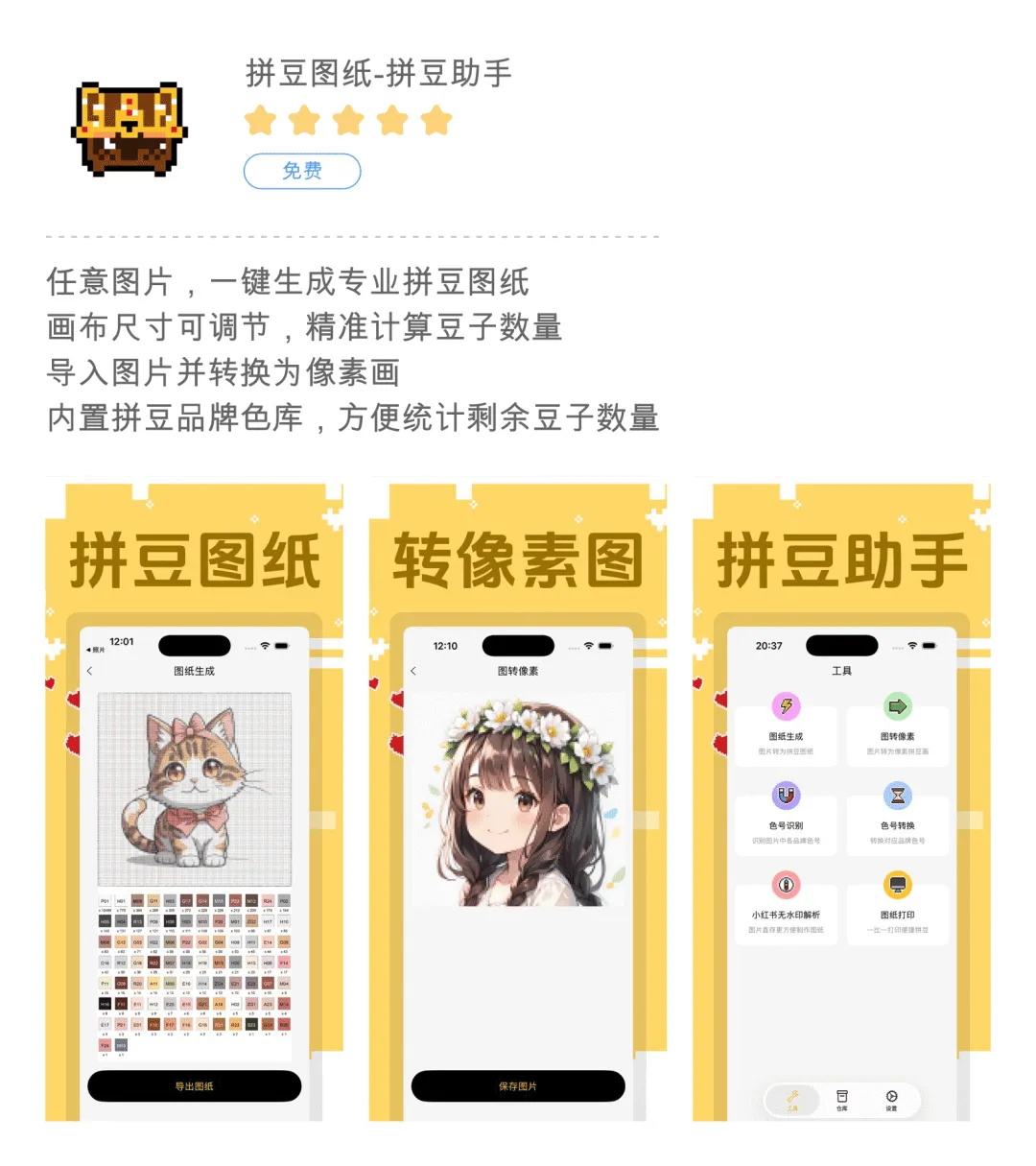 自从发现了这些拼豆App,真的打开了新世界的大门!随时随地都能开启一场独处的治愈修行。 海量像素画板任你挑,一键生成图纸,还能上传喜欢的图案,自己设计图纸。填满强迫症的快乐。
