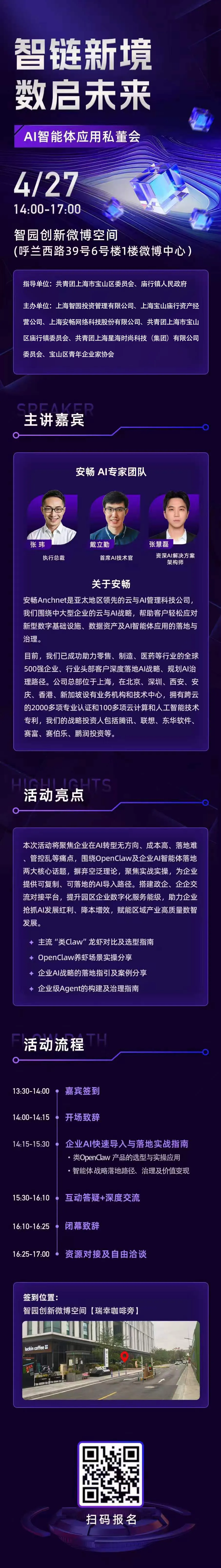 OpenClaw实操+落地→AI抢跑窗口期高端私董会,限时开放! AI转型没方向、成本高、落地难、管控乱? 别再只听理论!这场“纯实战、可落地、能复用”的AI私董会,帮你把AI真正用进业务里。 欢迎企业创始人/总经理/高管扫码报名参加! 理论千遍,不如实战一遍!解决 AI 转型所有难题,OpenClaw 实操落地、专家一对一答疑、高端资源互通,这场高端私董会全部给到。 供稿:镇团委 经发办