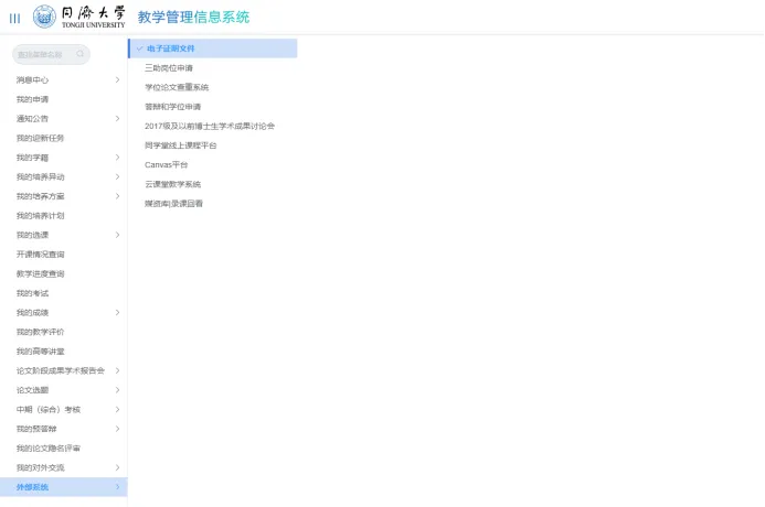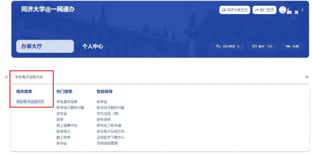 或者,浏览器访问一系统(1.tongji.edu.cn),通过统一身份认证登录。然后,通过菜单栏“外部系统”,点击“电子证明文件”,进入一网通办页面。