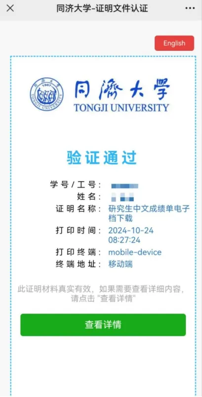 扫描打印成绩单或其他电子证明文件左下角的二维码,可看到学校一网通办平台的验证信息。