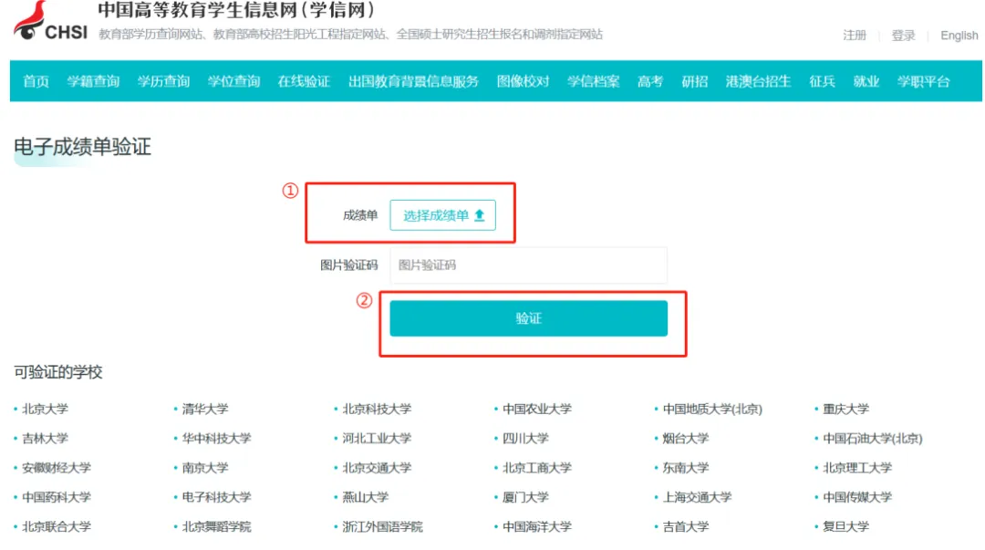 上传可信电子成绩单PDF文件后输入验证码,并点击验证,即可查看验签结果。