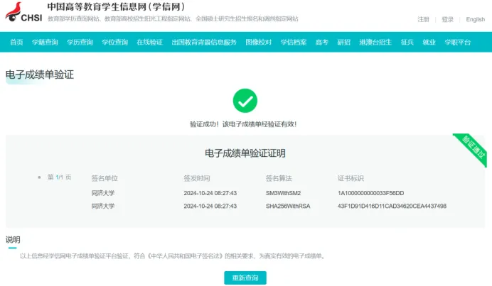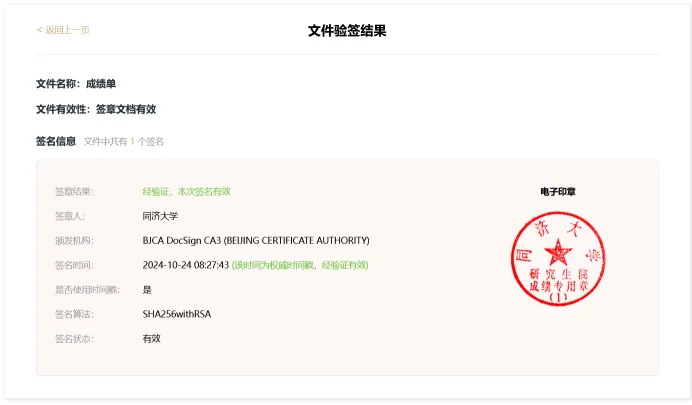 上传可信电子成绩单PDF文件后点击验证,即可查看验签结果。