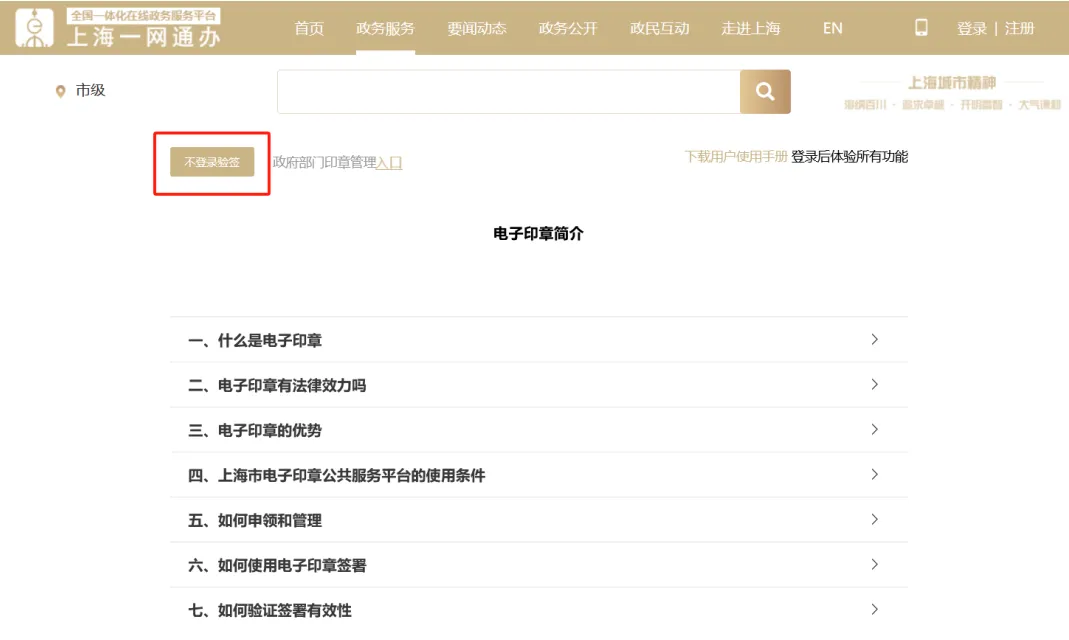 访问上海市一网通办电子验证服务,点击不登录验签。