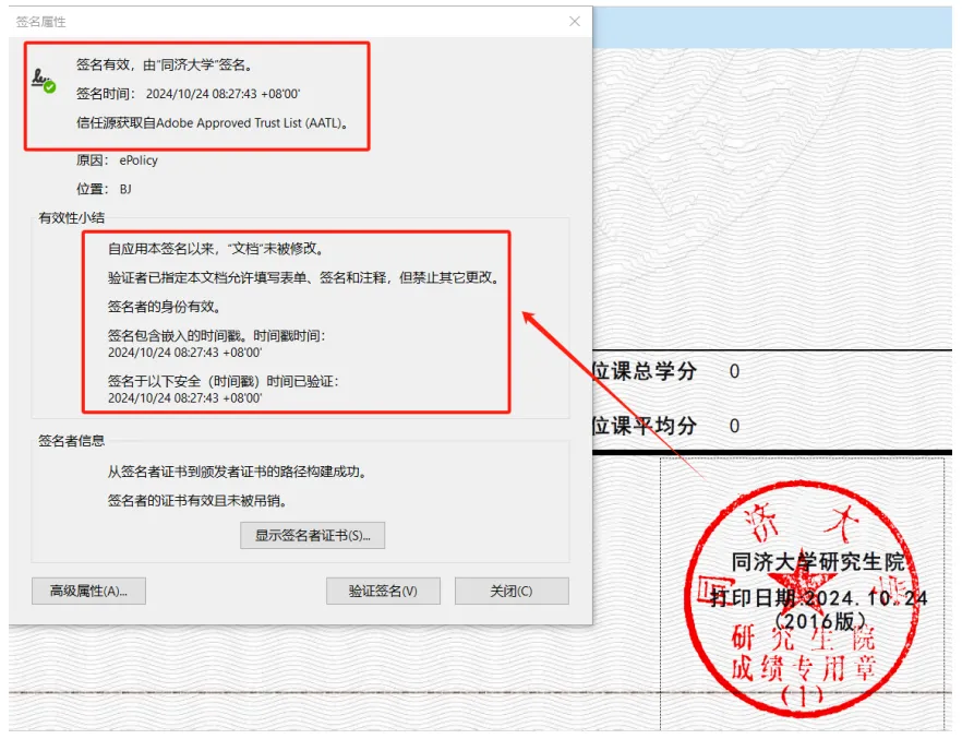 通过Adobe PDF阅读器打开电子成绩单,点击印章查看签名有效性。