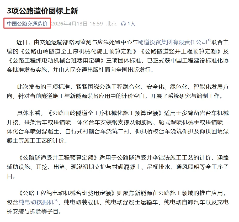 近日,由交通运输部路网监测与应急处置中心与蜀道投资集团有限责任公司联合主编的《公路山岭隧道全工序机械化施工预算定额》《公路隧道竖井工程预算定额》及《公路工程纯电动机械台班费用定额》三项团体标准,已正式发布实施。同望造价软件现已完成三项标准的定额库更新,满足造价编制与应用需求。