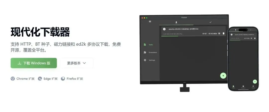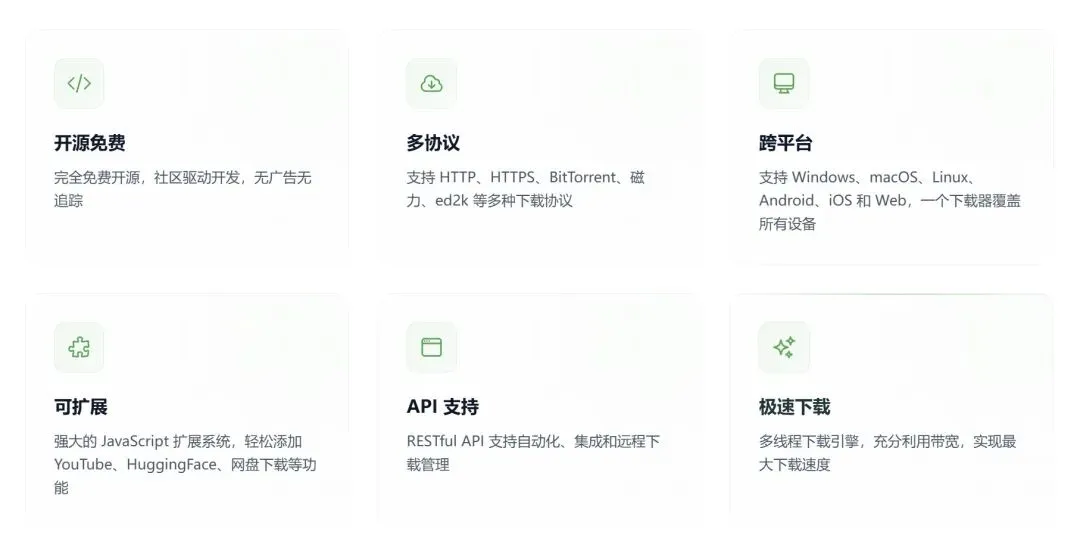先说说它最戳人的核心优势:完全免费开源,无任何捆绑,界面清爽无广告;多线程引擎拉满带宽,大文件秒下不卡顿;全平台通吃,电脑手机无缝切换;协议全覆盖,HTTP、HTTPS、BT、磁力、ed2k 全都支持;还能装扩展、调 API,普通用户最关心的是否能接管浏览器,答案是肯定的,有专门的浏览器拓展,同步更新了~
