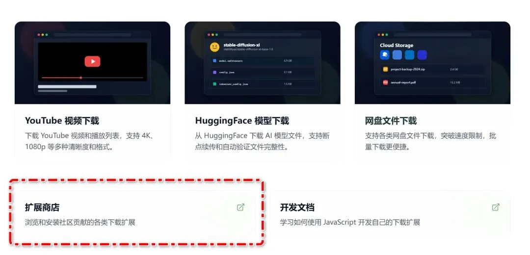 自带 JavaScript 扩展系统,官方扩展商店一键安装,支持 YouTube 视频下载(4K/1080p 任选)、HuggingFace AI 模型下载、各类网盘解析提速,轻松解锁更多下载场景,普通用户也能秒变高手。