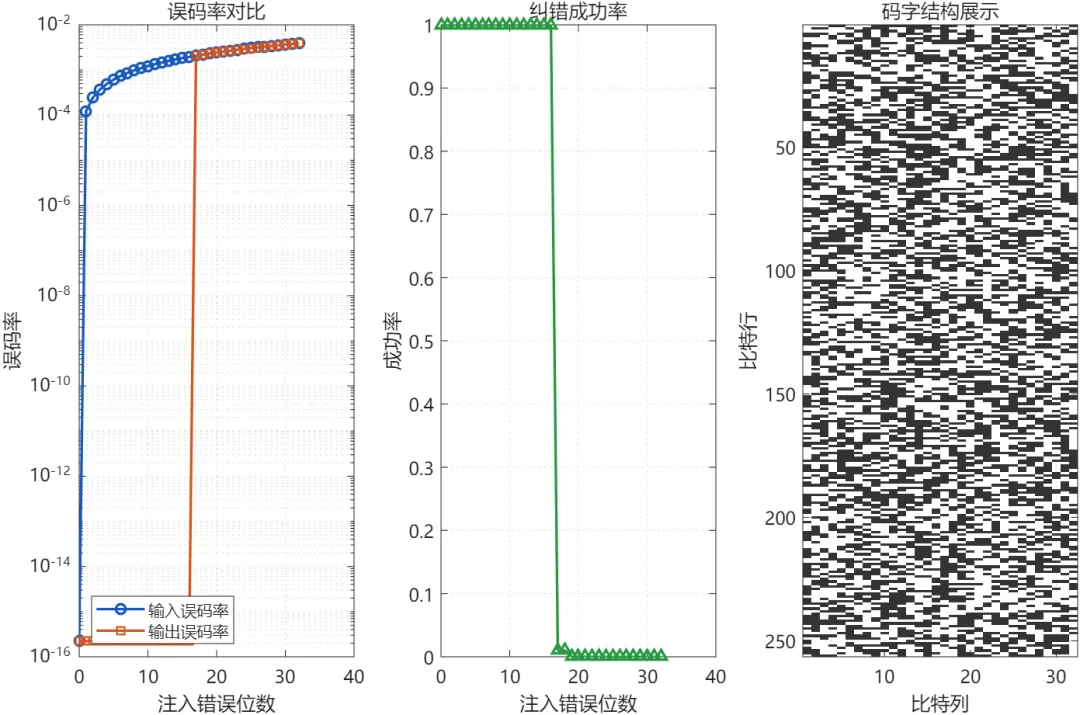 输出误码率曲线、纠错成功率与码字结构示意图。