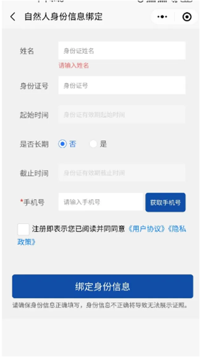 第三步:身份信息绑定,输入身份证背面起始时间,相应的验证码。