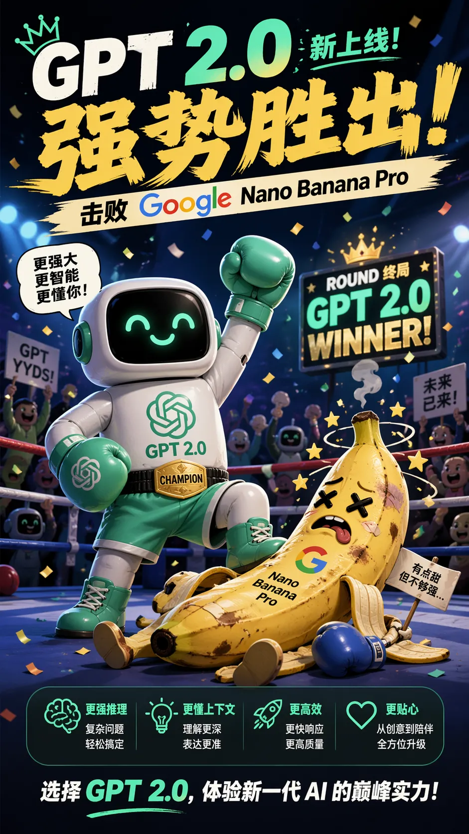 GPT击败Nano Banana的霸气对决海报,画面张力十足,文字清晰有力。