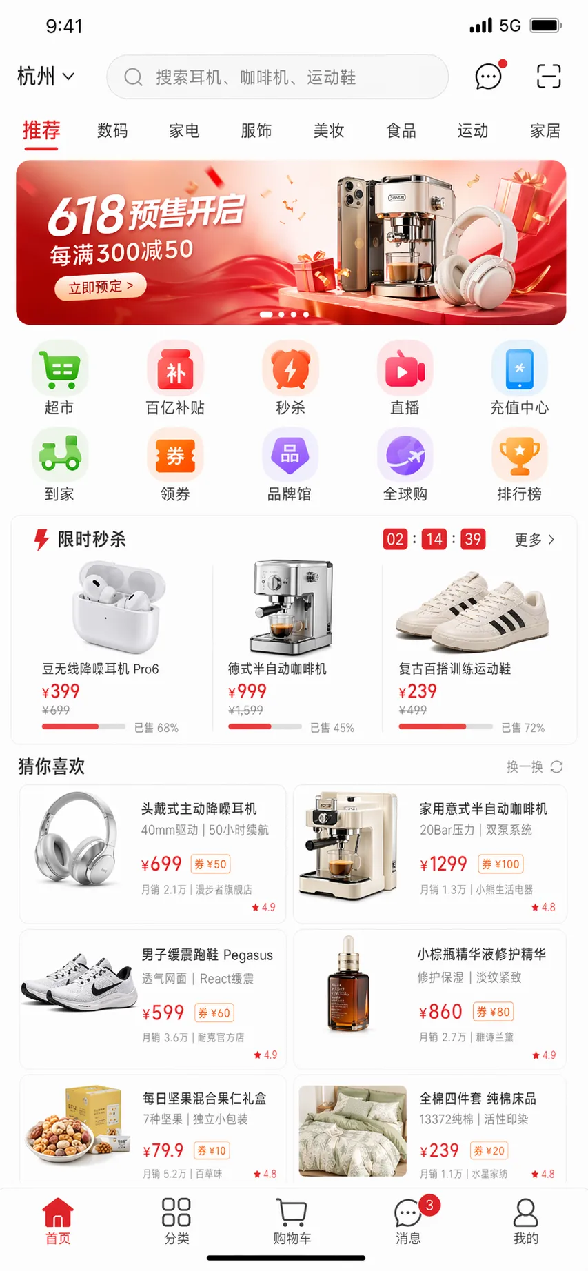 完整APP界面,多标签页、瀑布流商品、促销banner一应俱全。