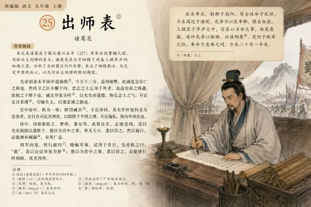 部编版初中语文课本《出师表》课文插图,传统工笔淡彩国画风格,三国时期蜀汉丞相诸葛亮的半身像,他正于军帐内伏案书写奏表。诸葛亮面容清俊沉稳,头戴纶巾,身着素色宽袖汉服,手持狼毫毛笔,目光专注地落在面前的简牍上。案几上摆放着一盏青铜油灯、堆叠的竹简、笔架与砚台,背景是素色帷幔,远处虚化的军营与山峦透出古战场的肃穆感。整体色调温润典雅,线条细腻柔和,无现代元素,画面干净,符合义务教育语文教材的审美标准,氛围庄重而宁静。