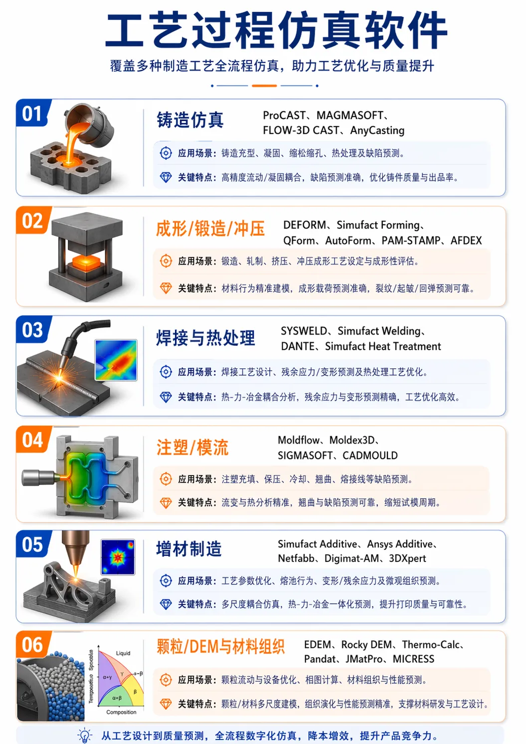 2)工艺过程类:铸造、成形/锻造/冲压、焊接与热处理、注塑/模流、增材制造、颗粒/DEM与材料组织。