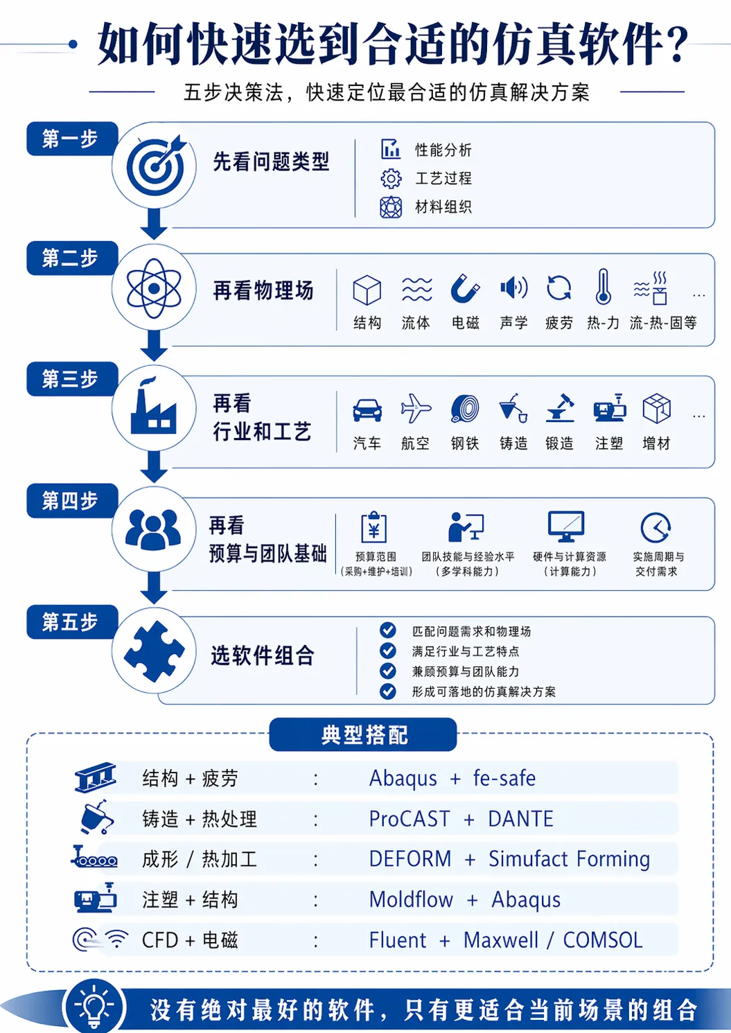 所以,选型时最重要的不是盲目追品牌,而是先把问题分清楚:你到底是在做结构、流体、电磁、寿命,还是铸造、成形、焊接、注塑和增材?问题分对了,软件就好选了一半。