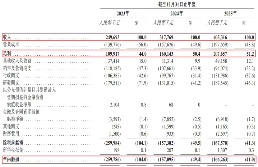 2023年、2024年及2025年(报告期),公司分别实现收入2.5亿元、3.18亿元、4.05亿元,毛利率分别为44.0%、50.4%及51.2%。