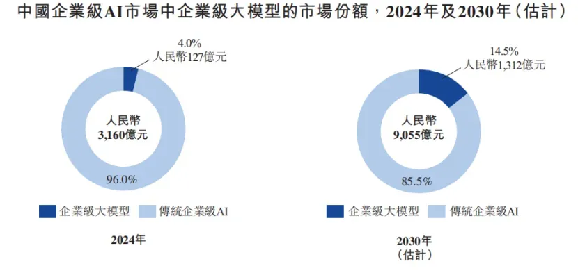 根据灼识咨询的资料,2024年中国企业级人工智能市场规模已达3160亿元,预期至2030年将突破人民币9000亿元,复合年增长率为19.2%。